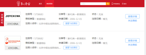 经过查询,我们可以看到,几乎所有带有“CHINA”的商标注册申请都处于“无效”状态,这其中,就有两枚与China Joy非常近似的“Joy China”商标申请,不出意料的,这两枚“Joy China”商标申请也被打入了“无效”的冷宫。
