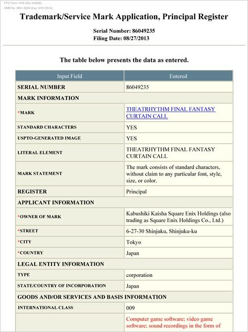 大墨知识产权网(ipchina.com) 9月3日消息, 史艾目前在美国注册了一个名为“Theatrhythm Final Fantasy Curtain Call(最终幻想:节奏剧场 谢幕)”的新商标,这看起来和曾在3DS上推出的《最终幻想:节奏剧场》有很大关联,是其新作的可能性很大。如果是新作会是什么平台呢?也许依然是3DS/iOS。
