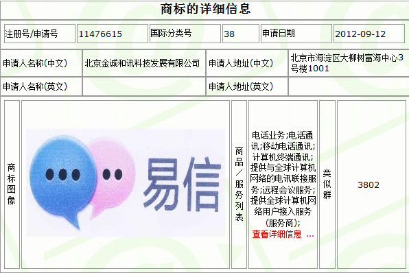 从截图信息看,该商标出于申请状态,而非部分媒体所称的“注册”状态。但据商标法规定的先申请原则,北京金诚和讯科技发展有限公司可能会获得易信商标权。