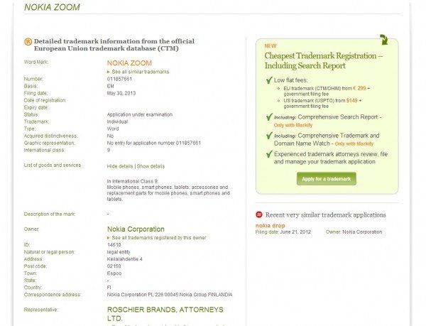 根据报道,来自欧盟商标数据库(CTM)的信息显示,诺基亚在今年五月三十日提交了名为“Nokia Zoom”的注册商标,并且由于该商标属于国际第九类,也就是为智能手机或平板电脑等设备使用,所以有人猜测,这或许意味着诺基亚EOS未来的名称有可能是“Nokia Zoom”。