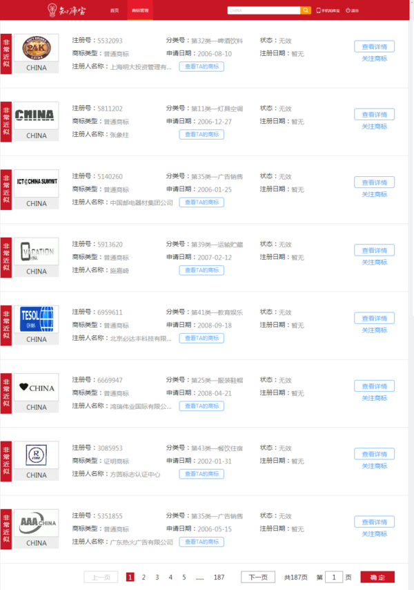 经过查询,我们可以看到,几乎所有带有“CHINA”的商标注册申请都处于“无效”状态,这其中,就有两枚与China Joy非常近似的“Joy China”商标申请,不出意料的,这两枚“Joy China”商标申请也被打入了“无效”的冷宫。